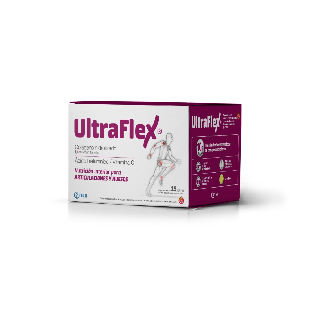 No se utilice si es sensible o intolerante al colágeno o a alguno de los componentes de Ultraflex®. Consulte a su médico antes de consumir este producto. No utilizar en caso de embarazo o lactancia. No administrar a niños. Consumir este producto de acuerdo a las recomendaciones de ingesta diaria establecidas en el rótulo. El consumo de suplementos dietarios no reemplaza una dieta variada y equilibrada.